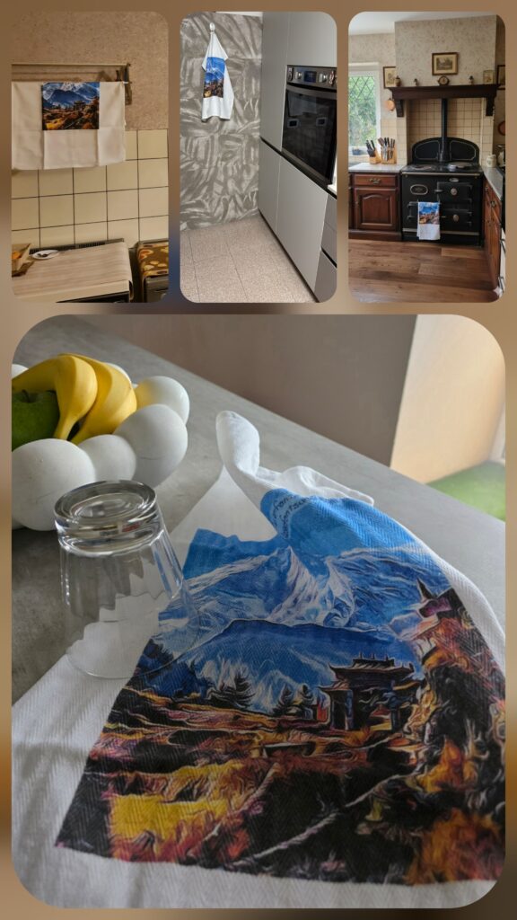 - Et ce sont des torchons que nous mettons aussi en vente. Ils sont en coton et uniques aussi car nous avons repris une photo du Népal. Ils sont en vente à 10€/pièce. Carmen, Iris, Paloma et d’autres amis se sont laissés tenter. Et vous ? Les sommes recueillies nous aideront à financer notre projet : la construction d’un bâtiment à la Saraswati School